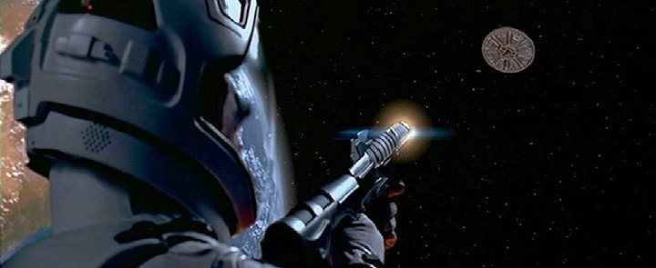 Only ever seen in the Star Trek: First Contact EVA sequence. More interesting is its wide nozzle and the large gold pulses it fires - it reminds me more of a disruptor than a phaser. . . The spacesuits have since been used in Voyager - but not the phaser rifle. Prop designed by John Eaves. |