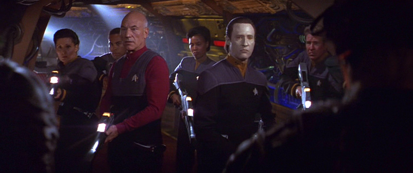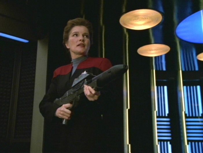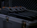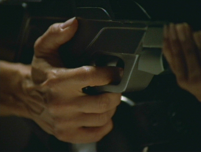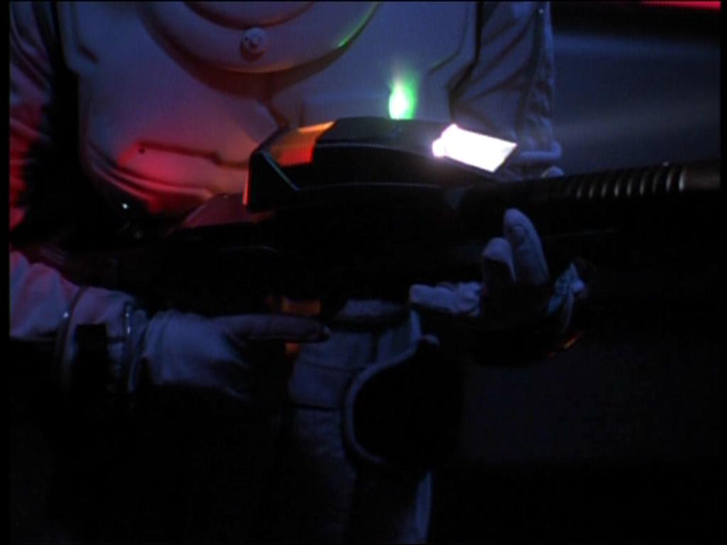 Introduced for Star Trek: First Contact - mercifully; I couldnt bear the thought of Picard and co. carrying those plasticky-looking Compression rifles to fight the Borg! There were originally two versions, which are almost identical. The designations Type-IIIa and 'Type-IIIb' are ones I chose to differentiate between them, and was initially based on the fact that one version, with its slim, rounded, almost phallic barrel has been seen more often since: on Voyager; carried by Nog in DS9's "Empok Nor;" and in Star Trek: Insurrection. However! It's been many, many years since then, and over time the popular opinion has the original Type-3b to be the FIRST model, making the Type-3a now the 3b. I have redesigned this page to accomodate this. It's a point of view I've held for a while, and have admitted publicly when challenged (ironically, I did originally consider making the square-barrel the A and the curvy-barrel the B, because 'A' is an angular letter and 'B' is curvy!); but the increasing number of abusive emails (yes, really) has forced me to get around to making this change. The other version has a blunt triangular barrel. Why theyd design two so similar is uncertain - in fact, continuity errors in Star Trek: First Contact suggest no-one has noticed the differences. It hasn't been seen since, apart from an appearance in an Okudagram in Voyager's "Bliss" (I know I didn't imagine it, but I've been unable to obtain a screencap); and, I originally thought, also re-dressed as a non-Federation weapon sold by arms dealer Hagath in DS9's "Business as Usual." (but DVD caps have since proved me wrong); Perhaps most telling is the fact, unnoticed by me for a long time, that at no point in First Contact is this model seen to fire! All FX shots involving weapons fire are done with the curvy-barrel. . . It would appear that what happened is, the first sequence to be filmed was the sneaking-to-Engineering scene, using the angular-barrelled props (plus a few other scenes with them in - the Captain Ahab scene, for one; plus they're visible in racks in the background in the Armoury scene). These were then replaced with the curvy-barrels for all later scenes. Stranger still, in the approach to engineering the rifles all have smooth featureless upper barrels, yet elsewhere they have a ribbed cutaway section. Why? I've never received a satisfactory/official answer. In the images below, I've arranged them in exact chronological order to show how and when the change-over(s) happen. Quite recently, however, Kevin Ericon got in touch with a fantastic discovery about the fate of the angular-barrelled rifles. He suggests they were converted to curvy-barrels by having the angular barrel removed. Which makes sense. More importantly, he's found a re-use of the angular barrel, re-dressed as a Ferengi rifle prop in the Star Trek: Enterprise episode "Acquisition." And indeed there it is, flipped upside down, with a couple of TNG Rifle handles added (in an almost Sten-gun configuration) and painted rust-red! In Star Trek: Nemesis, the IIIa prop design has been overhauled with some redressing of the weapon, and a new light/sight array. This comprises a powerful Maglite-style torch with a Bushnell HOLOsight (the model 50 range, since replaced with the model 51), a real-world hunting sight that provides holographic crosshairs. Since even a working basic model has a price tag of US$100+ in 2002, it would appear that upgrades to rifle props (unnoticed by the majority of the cinemagoing public) would cost several hundred dollars each! These rifles fired silvery-gold pulses in First Contact, Insurrection and Nemesis, and gold beams and pulses in Voyager. Nemesis also revealed the on-ship storage arrangements for such rifles, at least on a Sovereign-class vessel: rotating panels that spin round to reveal two rifles per panel. More interestingly, one crewman on removing a rifle first pulls open a small slot aft of the sight, showing a red light beneath - was this meant to 'cock' the rifle, or check for the presence of a power cell? After letting the panel snap back home, he then pressed the left-hand button (as on a Type-II phaser) which caused the green LED to light up, showing a full charge. . . I've often wondered if these are actually disruptors. They obviously operate in a very different manner to the traditional phaser, although this could be explained by classifying them as the 'regenerative phasers' mentioned in DS9's "Field of Fire." As I understand it, disruptors work on different principles - might this be why, in First Contact, after warning against using phasers in Engineering and inadvertently hitting the Warp Core with particle beam fire, Picard then tells them to aim for the coolant tanks - right next to the Core?! The props were designed by John Eaves. Patrick Stewart's "hero" version even had a working retractable nylon strap - apparently the only one to be made thus, all others had simpler adjustable straps. Prop images: 1, 2, 3, 4, 5. |